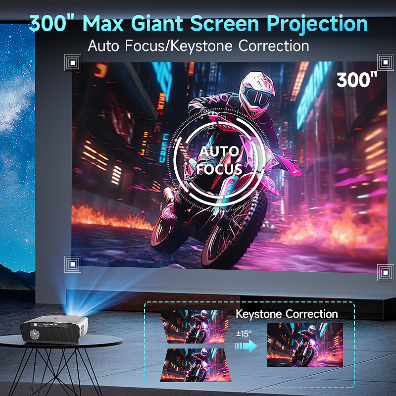 | Android system | Android 9.0,with wifi(android/IOS cast-Miracast),IOS Wired Screen Mirroring,2G RAM and 16G ROM,3D Stereo Bluetooth speaker | Lam Type | 200W LED Lamp |